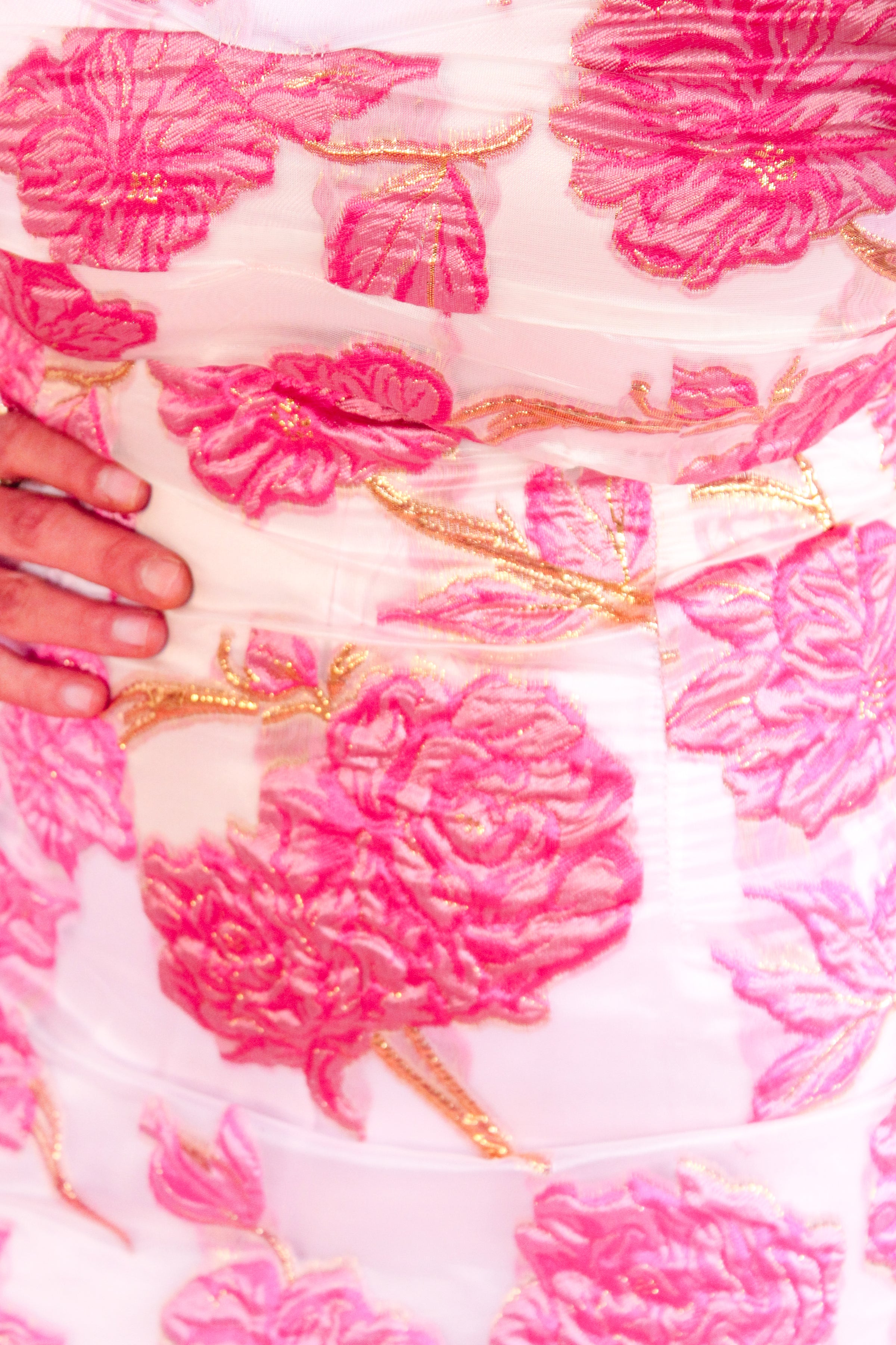 Get ready to bloom in this playful mini dress featuring a pink and gold jacquard floral pattern. Perfect for sorority recruitment or any occasion where you want to stand out with a touch of whimsy. Don't miss out on this trendy addition to your wardrobe!
