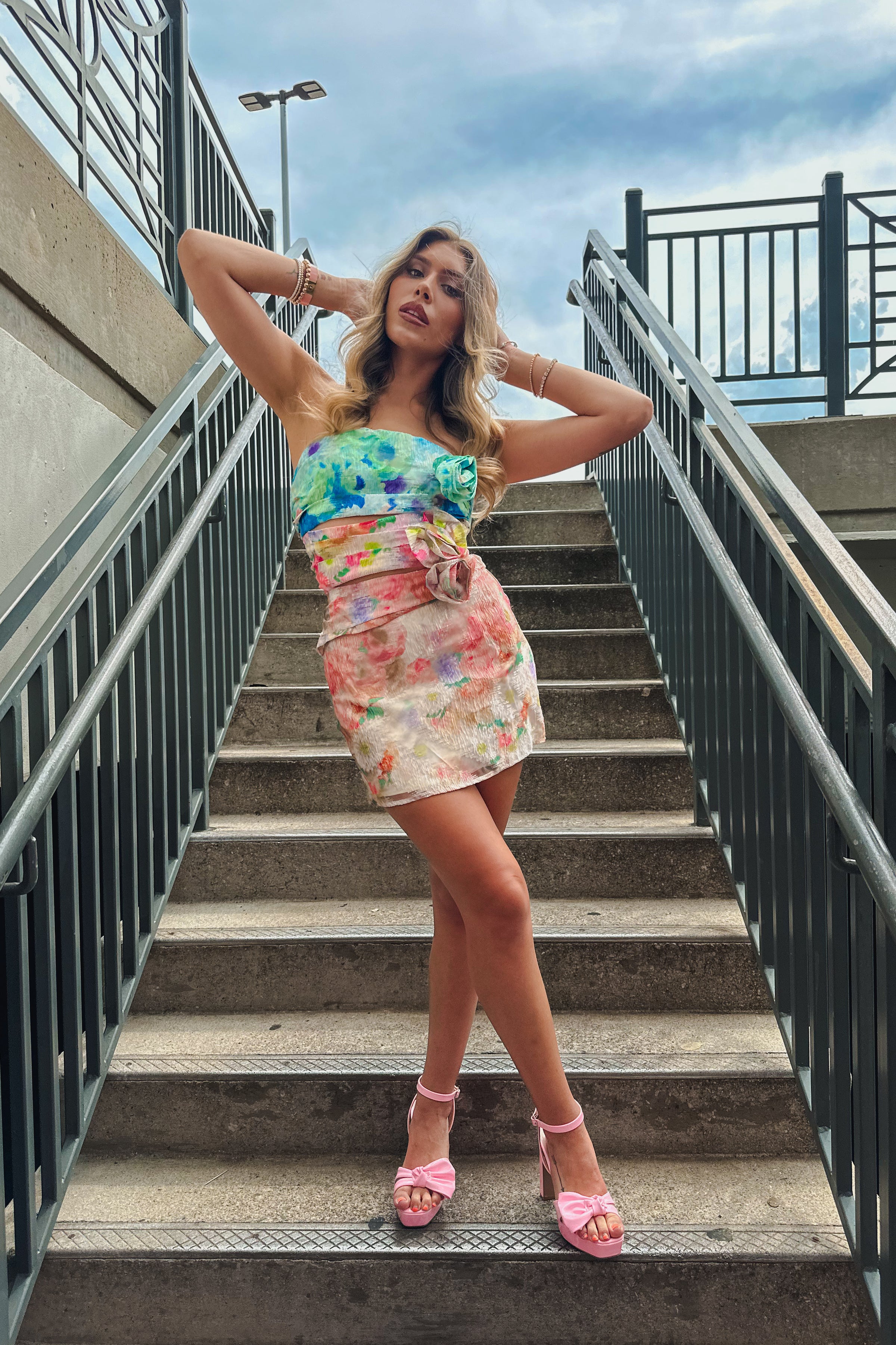 Get ready to rock the dance floor in our Pink Floral Jacquard Cut Out Rosette Mini Dress! Made from jacquard fabric, this mini dress features trendy cutouts and rosette details, perfect for a sorority semi formal or a fun vacation in Tulum, Mexico. Add a touch of style to your wardrobe with this pink and blue floral dress!